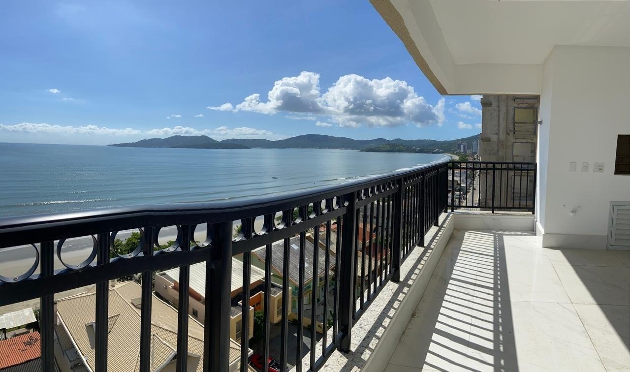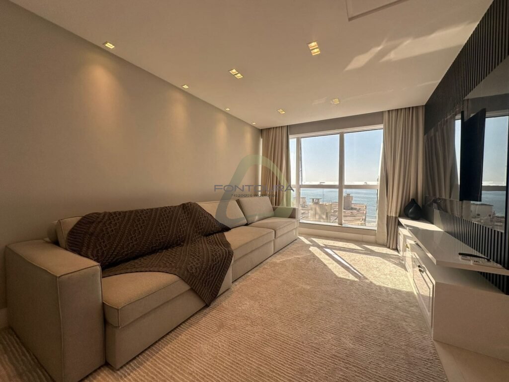 Living integrado com sala de estar e jantar Ampla sacada com churrasqueira e vista mar Sol da manhã